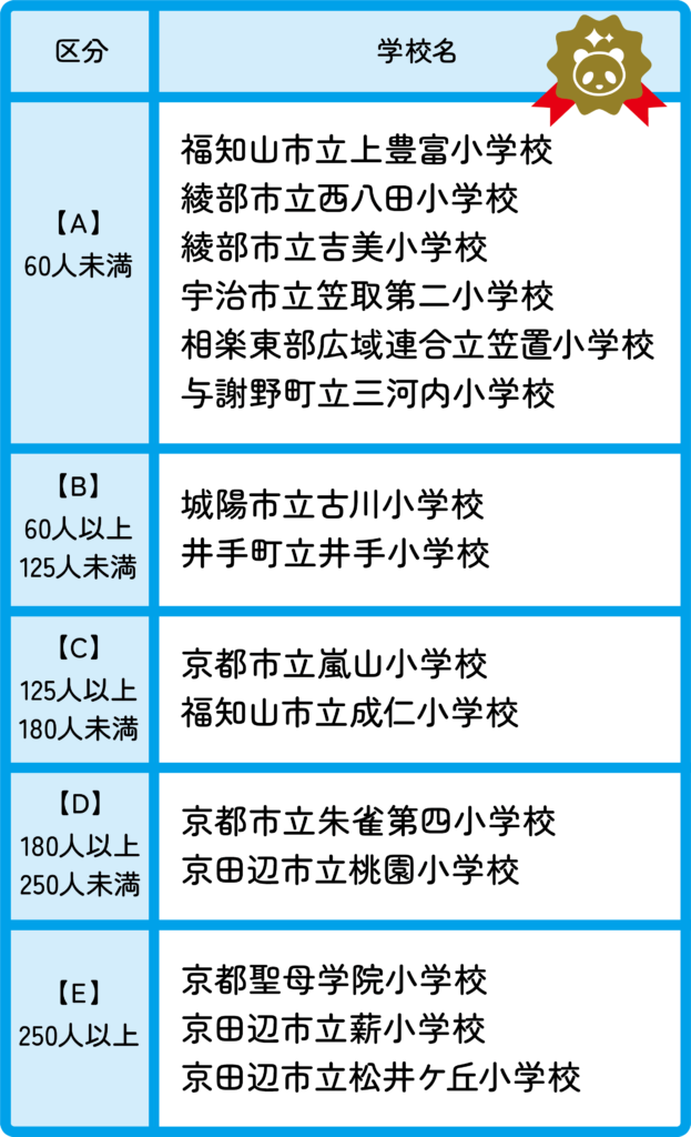4、5、6年生の総児童数に基づいて、参加校を5つの区分に分類し、各区分において参加率が上位の小学校を「優秀校」として表彰しました。