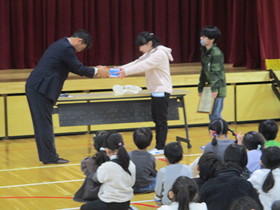 「4~6年生の子どもたちがお家の方とともに、がんばって『めざせCO2ゼロチャレンジ』に取り組んでくれたおかげで、優秀賞をいただき、副賞として『大阪ガスネットワーク賞』をいただくことができました。ありがとうございました。」