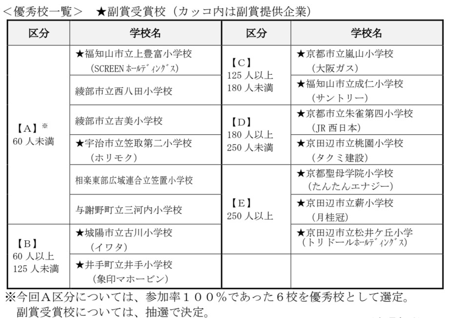 ・各区分で参加率が上位の2校(参加校数が多いE区分のみ3校)を表彰